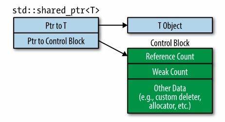 每一个std::shared_ptr管理的对象都有一个控制块。除了包含引用计数之外,如果该自定义析构器被指定的话,该控制块还包含自定义析构器的一个复制。如果指了一个自定义内存分配器,控制块也会包含一份它的复制。控制块还可能包含其他附加数据,包括如条款21提到的一个被称之为弱计数的次级引用计数,但我们在本条款中将忽略此类数据