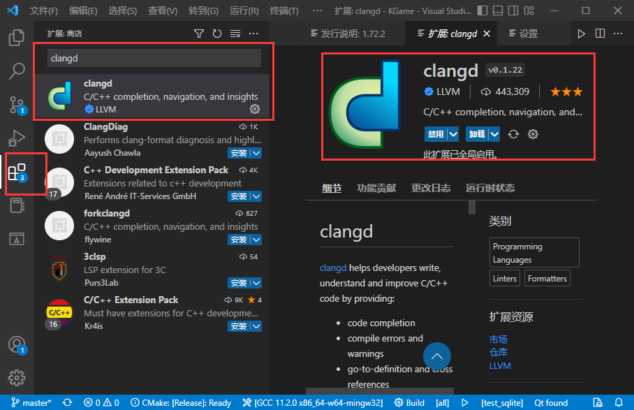 打开VSCode,在侧边栏选择扩展,搜索clangd并安装
