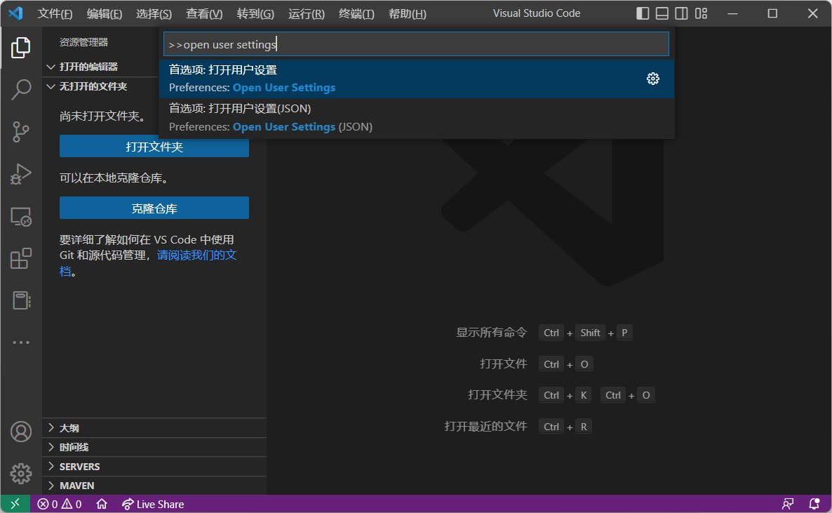 打开用户配置:在VSCode按下快捷键CTRL + SHIFT + P,输入'>open user settings json'