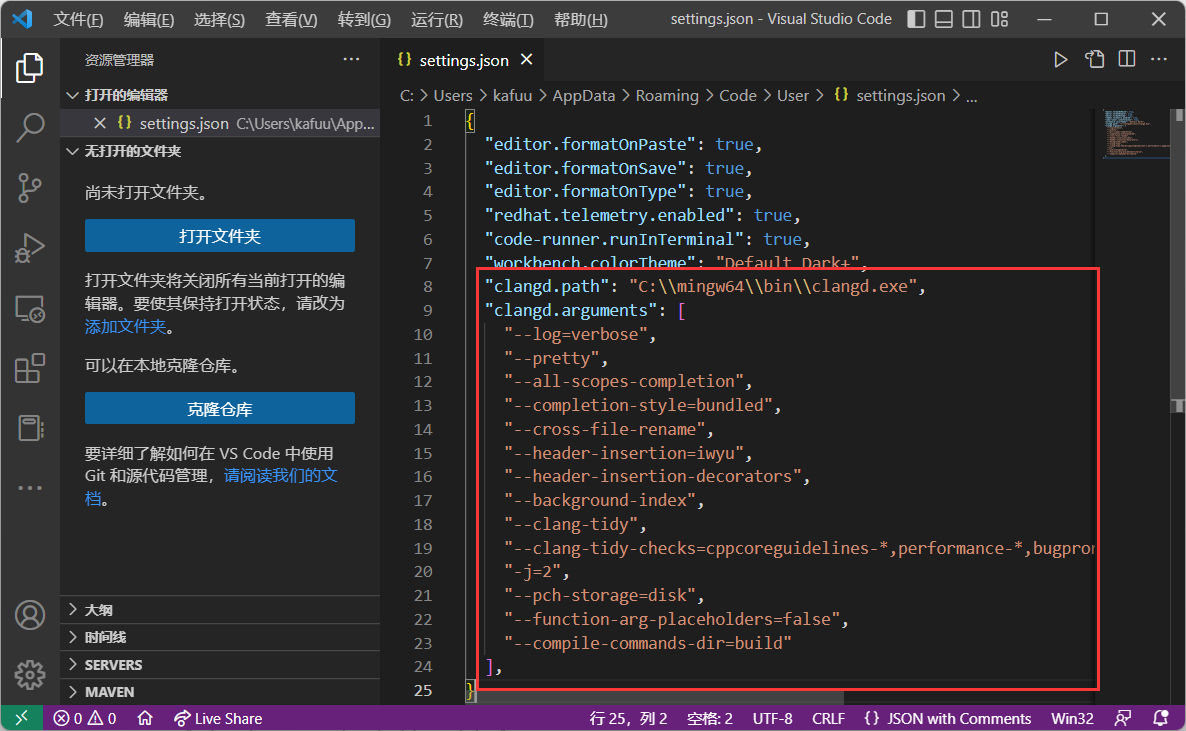 注意事项:在拷贝之前请先确认json中是否已经存在clangd.path和clangd.arguments项目,若已存在则直接在已经存在的项上修改
