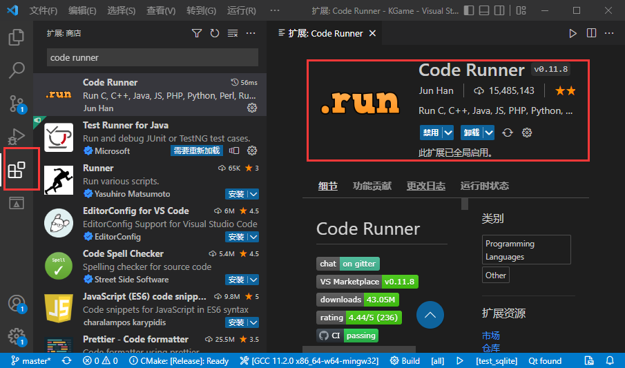 运行VSCode,并在拓展选项卡搜索Code Runner并安装