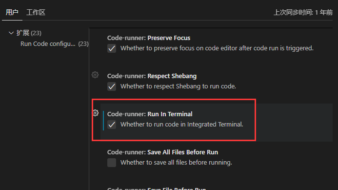 找到'Code-runner: Run In Terminal'选项并勾选