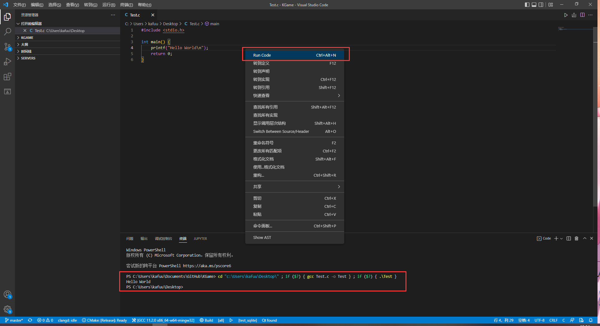 完成以上操作后关闭设置,并使用快捷键 Ctrl+N 创建一个新文件,键入测试代码后使用快捷键Ctrl + S 保存到任意目录(注意选择保存类型为c或c++),完成保存操作后在代码编辑页面内右击鼠标选择Run Code(或者使用快捷键Ctrl + Alt + N)运行代码。